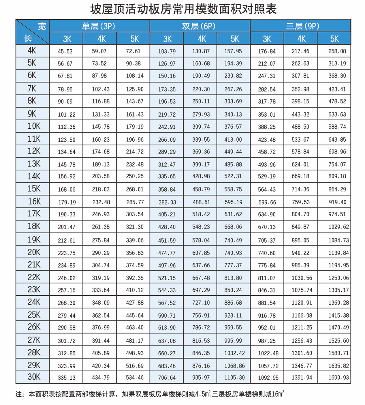| 標(biāo)準(zhǔn)坡頂活動板房的面積對照表如下: |