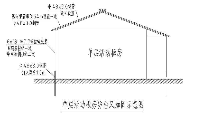 活動(dòng)板房的具體加固做法為:在板房屋面,采用φ48×3.0鋼管,豎向每3.64m一道,橫向在屋面頂部、坡屋面中部及屋面檐口處各一道,采用扣件搭設(shè)鋼管網(wǎng)格架,在板房四角部位,及縱向兩側(cè)邊中部,采用地錨與地面拉結(jié)加固,拉結(jié)采用6×19 φ7.7鋼絲繩進(jìn)行拉結(jié)加固,鋼絲繩拉結(jié)時(shí)必須拉緊(采用葫蘆拉緊,或采用M12花籃螺栓調(diào)節(jié)拉緊)。